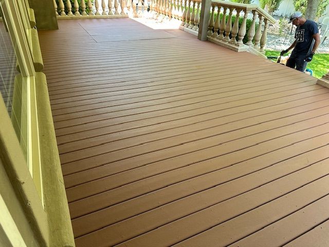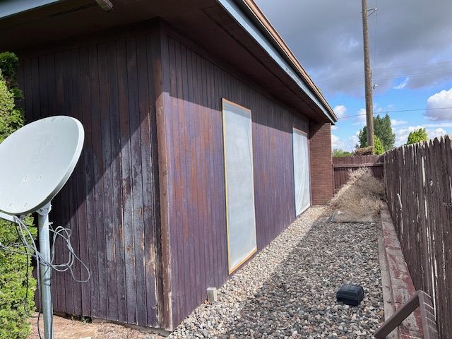 - In-progress documentation: Images that illustrate preparation steps—power washing, scraping, patching, and primer application.