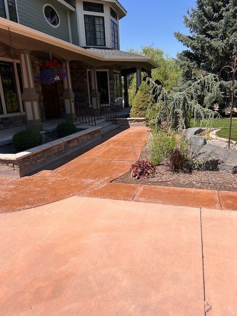 Driveway and patio surfaces before and after cleaning, crack repair, and sealer application producing consistent, protected finishes.